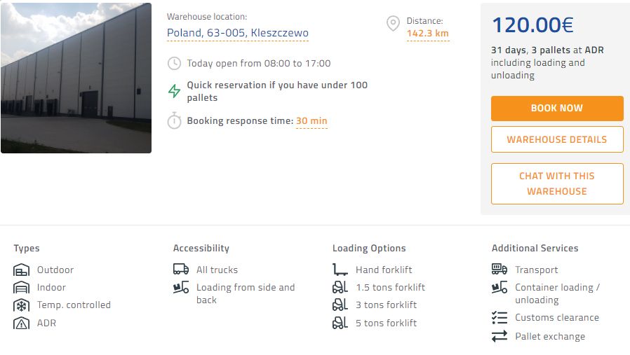 👉 Type of warehouse (Indoor, outdoor, temperature-controlled, warehouse for dangerous cargo and customs warehouse).