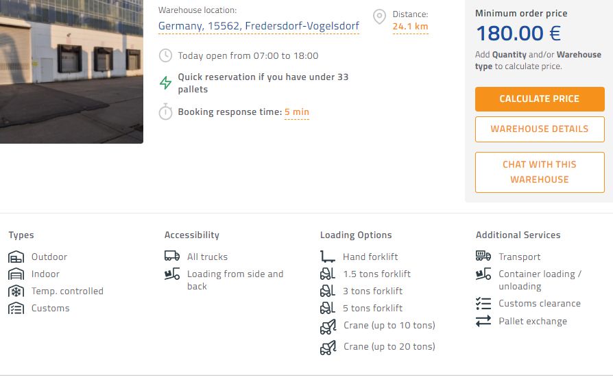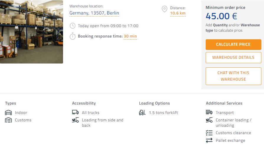 📍 Das nächstgelegene Lager ist nur 10 km vom Stadtzentrum Berlins entfernt. Dieses Lager bietet viele zusätzliche Dienstleistungen wie Transport und hat einen Startpreis von 120,00 EUR. Dieses Lagerhaus hat auch Bonded space. Prüfen Sie das nächstgelegene Lagerhaus auf diesem Link.