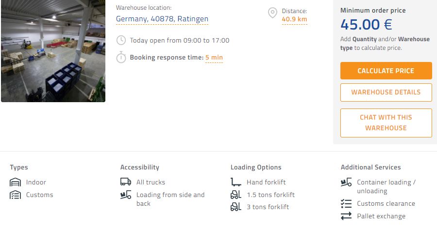 Berechnen Sie den Preis und nehmen Sie tatsächlich eine Reservierung vor. Auf der Suche auf Lagerlogistik.com sehen Sie Lager im Raum Düsseldorf ( Lagerlogistik Düsseldorf) und alle haben freien Platz für die Zwischenlagerung / Zwischenlagerung. Schauen wir uns an, was Ihnen eine Reservierung bringt: