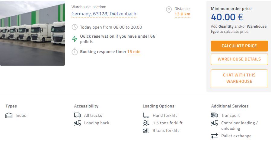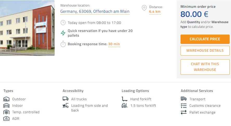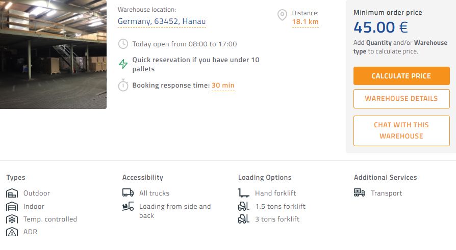 📍 Das vierte Lager befindet sich in einer Stadt namens Hanau (Lager Hanau) und ist 18 km von Frankfurt entfernt. Der Startpreis in diesem Lager beträgt 45,00 EUR. Dieses Lager bietet auch die Lagerung von gefährlichen Gütern (ADR) und Gütern, die ein temperaturkontrolliertes Lager (THERMO) benötigen.