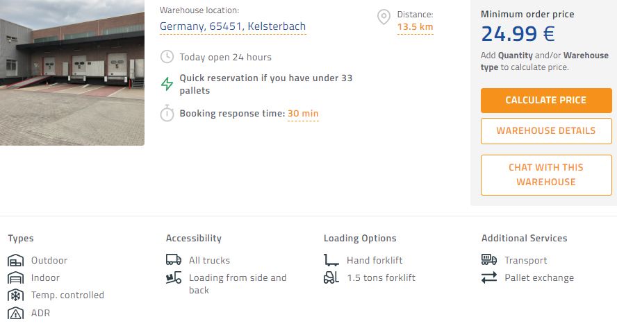 📍 Das dritte Lager befindet sich in einer Stadt namens Kelsterbach (Lager Kelsterbach) und ist 13 km von Frankfurt entfernt. Es bietet eine Sofortbuchungsoption für bis zu 33 EURO-Paletten. Dieses Lager ist spezialisiert auf kurzfristige Einlagerungen.