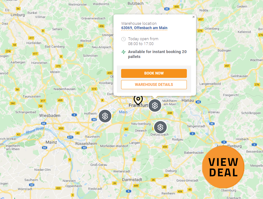 📍 Das zweite Lager befindet sich in Dietzenbach (Lager Dietzenbach). Dieses Lager ist 13km vom Frankfurter Stadtzentrum entfernt. Dieses Lager ist für Sofortbuchungen bis zu 66 EURO-Paletten verfügbar.