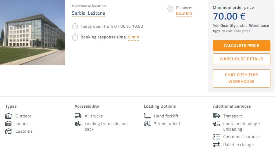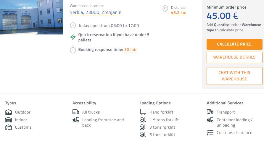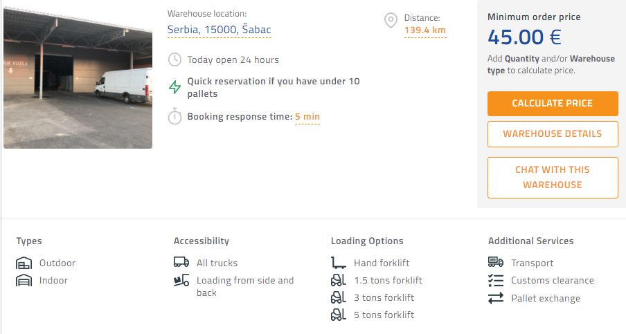 Takvu uslugu pruža StoringCargo.com, gde rezervišete prostor za određenu količinu robe na određeno vreme (npr: 28 paleta za 14 dana).