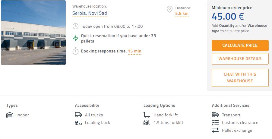 📍 Skladište u Novom Sadu pruža mogućnost INSTANT rezervacije do 33 EURO palete. Magacin u Novom Sadu nudi vam mogućnost prevoza i druge dodatne usluge.