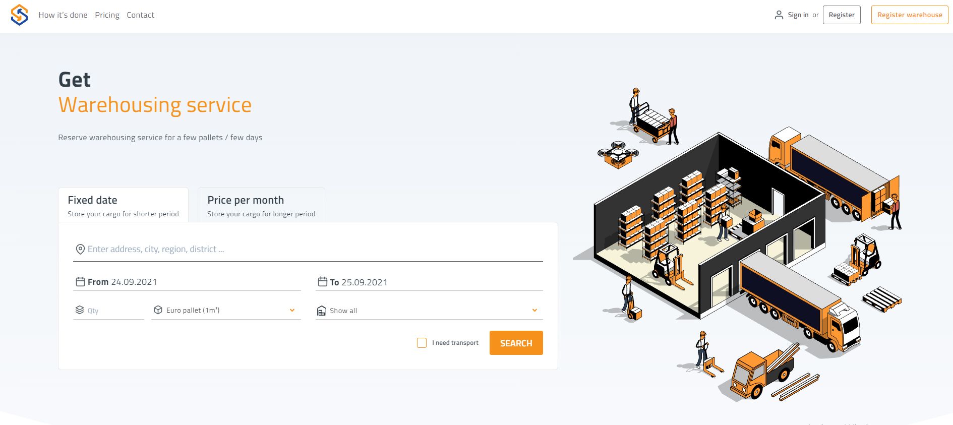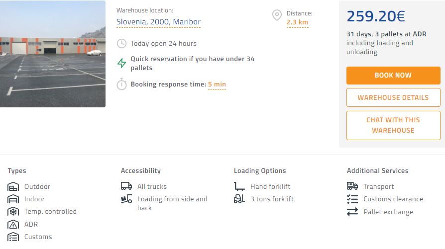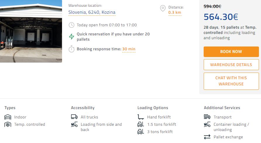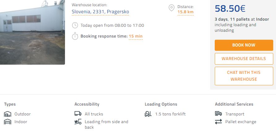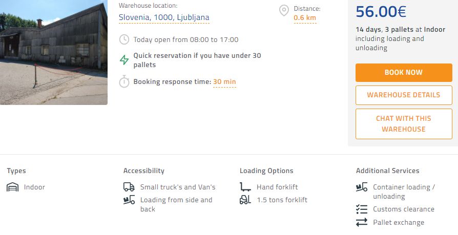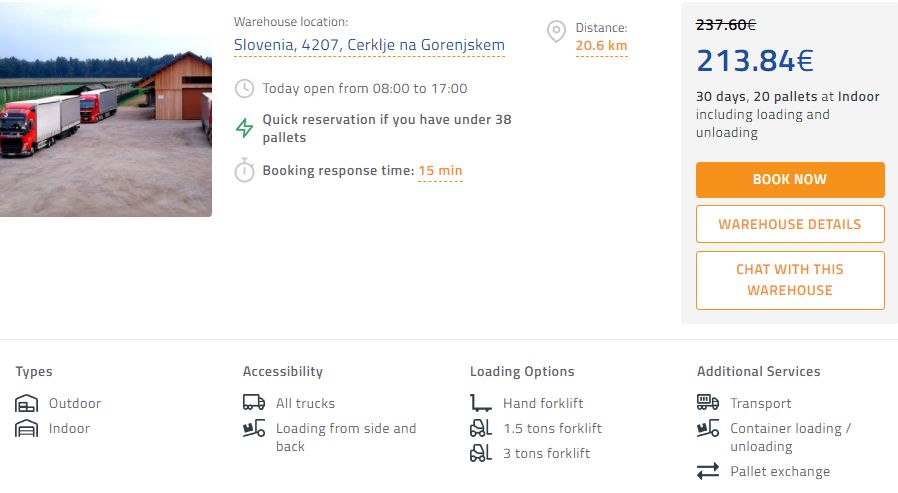Takšno storitev omogoča StoringCargo.com, kjer rezervirate prostor za določeno količino blaga za določen čas ( npr: 28 palet za 14 dni ).