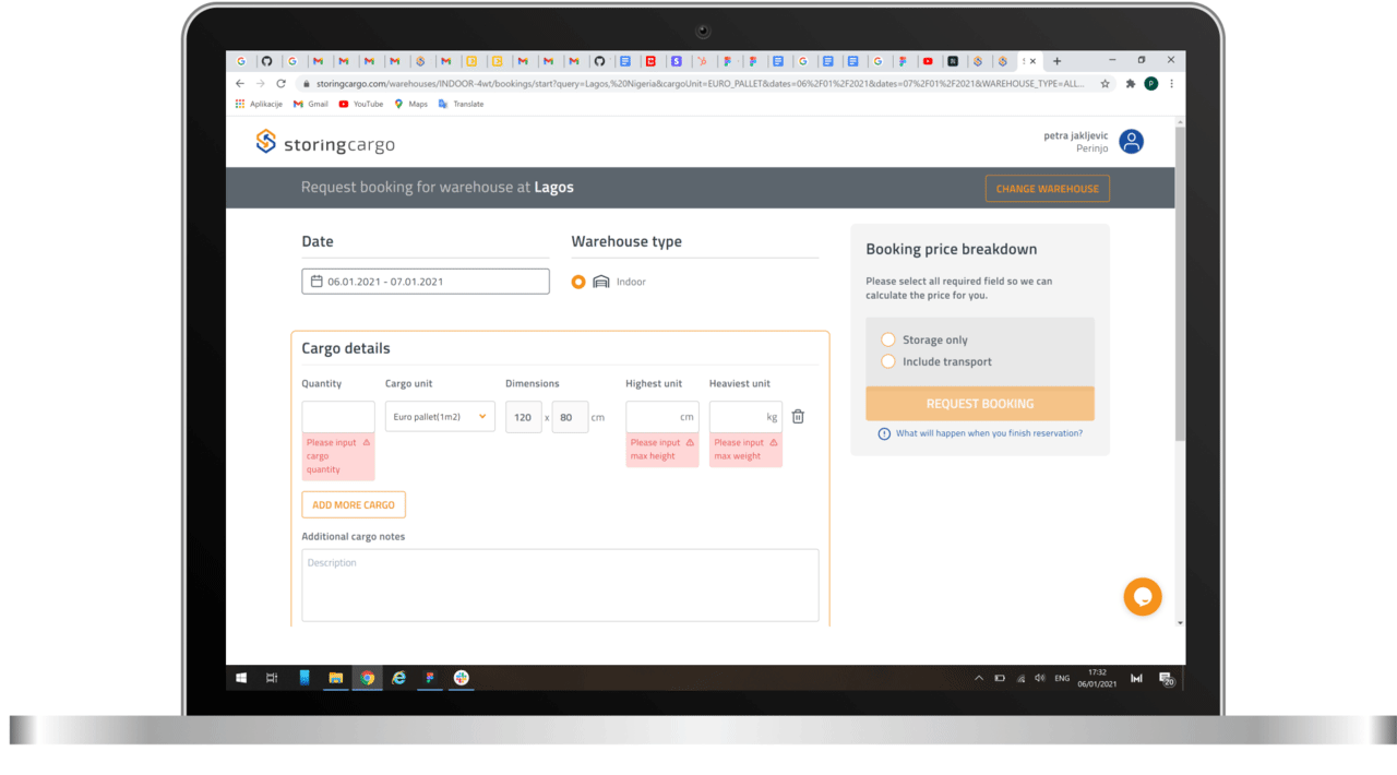 2️⃣ After you find what you are looking for, you will have to add some more details. Again write down the dates of storing and quantity, but dimensions, height, and weight are important as well so don’t miss that. If you want to include transport in the booking, just choose it before you finish with the request.
