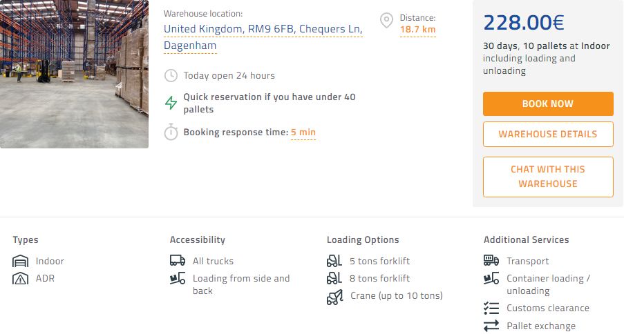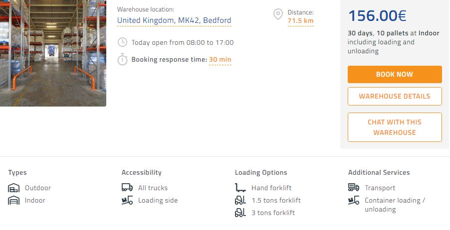 There are currently more than 488 warehouses available on our platform StoringCargo.com, which, in addition to warehousing, also provides transport. I present to you the top 3 that are currently available in the UK. The prices below will be for 10pal and 30 days of storage.