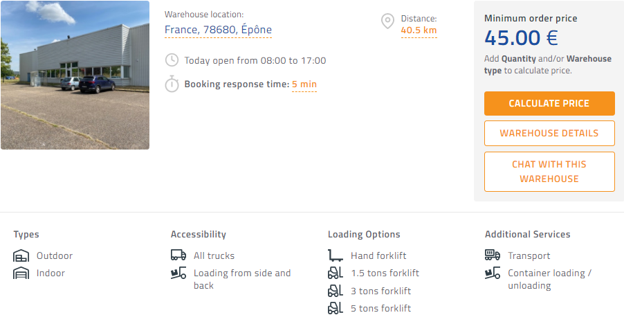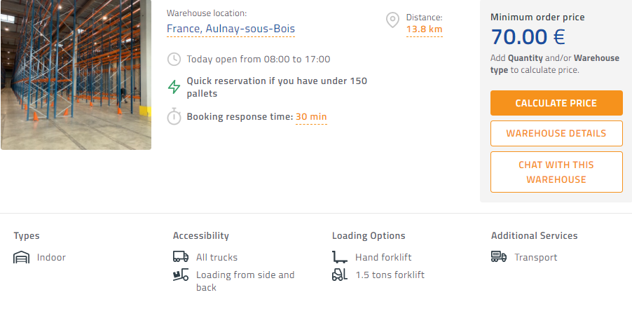 📍 The closest warehouse to Paris city center is only 14km away. The warehousing price starts at 70,00 EUR. This storage is available for INSTANT booking options up to 150 EURO pallets.