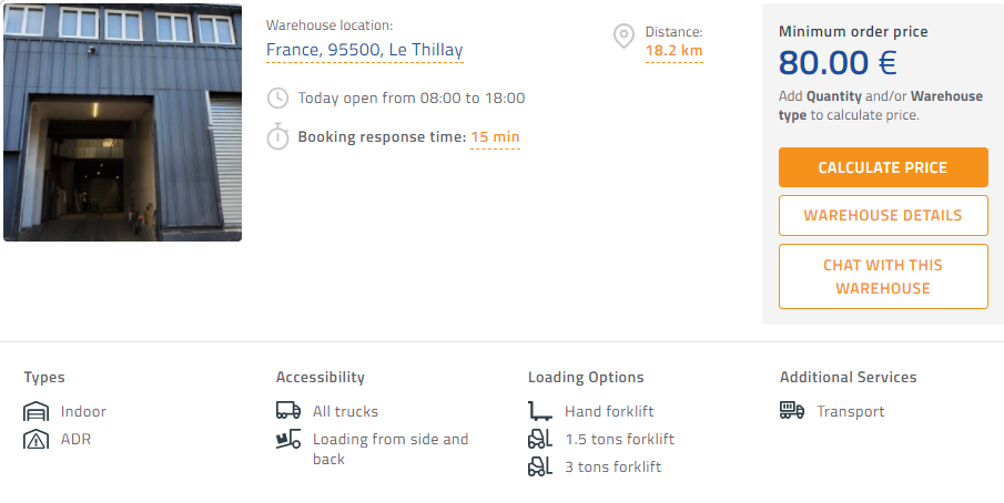 📍 The third warehouse is located in a city called Le Thillay (Entreposage Le Thillay) and is 18 km away from Paris. This warehouse can accept and store dangerous cargo (ADR).