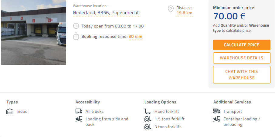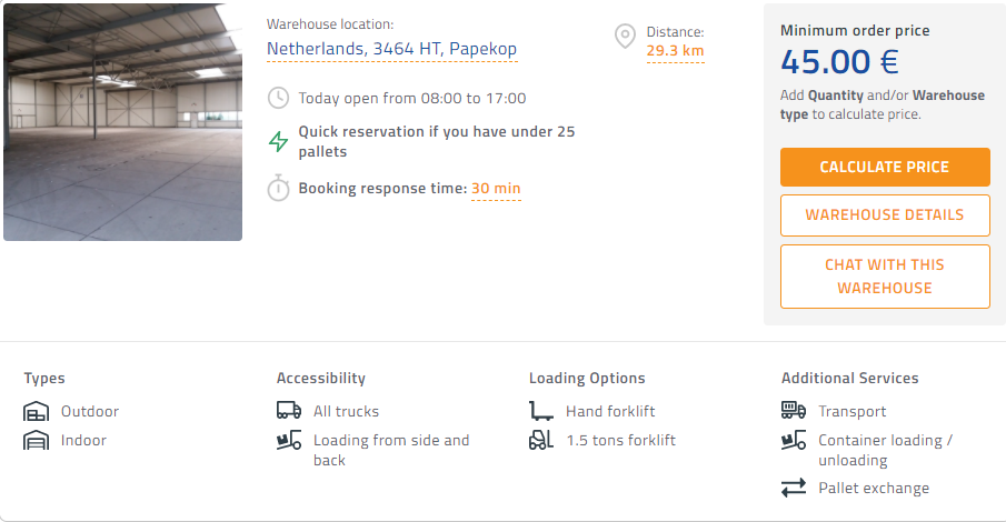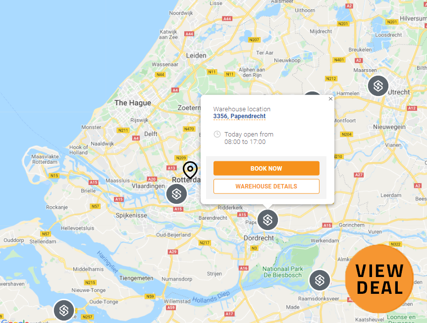 π A third warehouse is located in Papekop - 30 km from Rotterdam. They offer the option for instant booking for up to 25 EURO pallets.