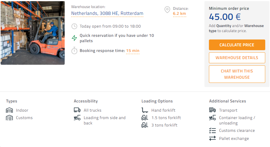 π The closest warehouse to Rotterdam city center is just 6 km away, and warehouse pricing starts at 45 EUR. Storage is available for instant booking, and Rotterdam Warehouses also offer bonded space.