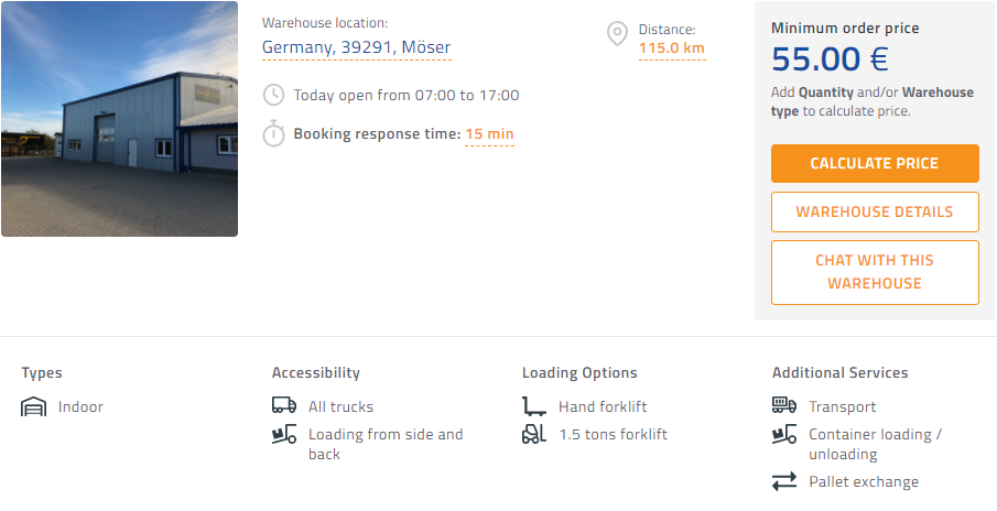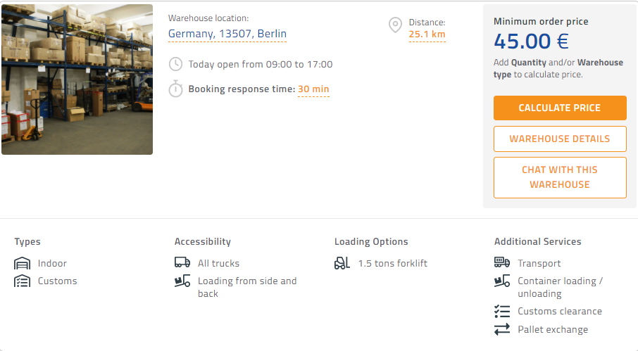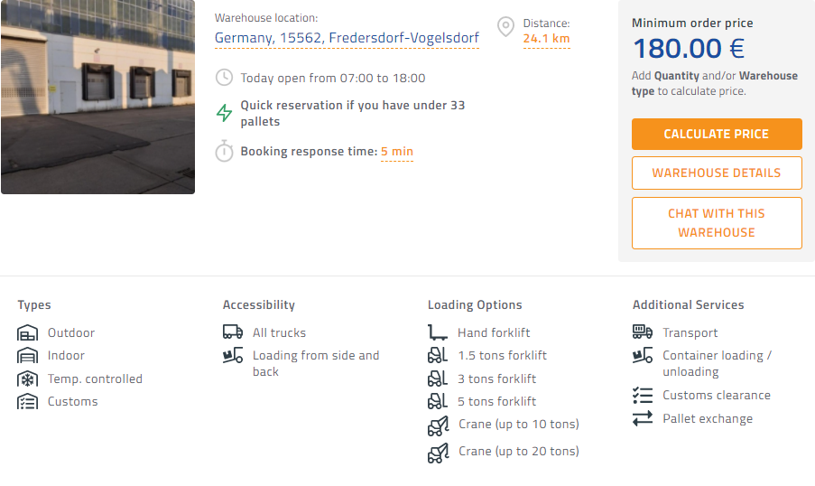π The third warehouse is only 115 km away from the city center of Berlin. This storage is offering many additional services like transport and has a starting price of 55 EUR. This warehouse has also Bonded space.