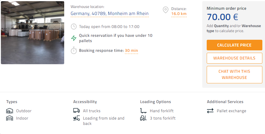 📍 The third warehouse is located in a city called Monheim am Rhein and is 16 km away from Dusseldorf. They offer an Instant booking option for up to 10 EURO pallets.