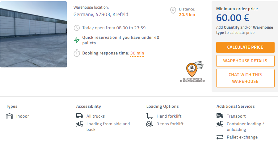 📍 The fourth warehouse is located in a city called Kerpen and is 42 km away from Dusseldorf. They offer an Instant booking option for up to 20 EURO pallets.