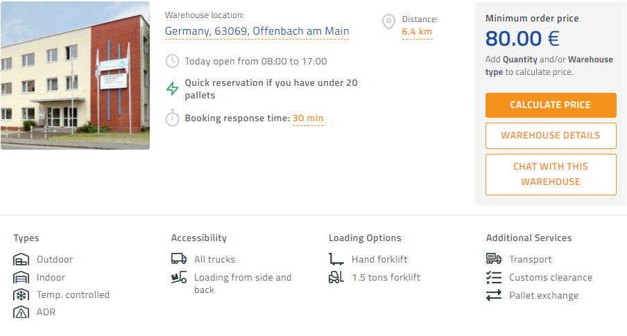 π The fourth warehouse is located in a city called Hanau (Lager Hanau) and is 18 km away from Frankfurt. The starting price for this storage is 45,00 EUR. This warehouse also offers storing of dangerous cargo(ADR) and cargo that needs a temperature-controlled warehouse (THERMO).
