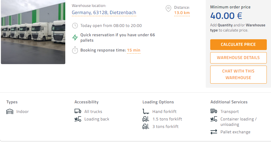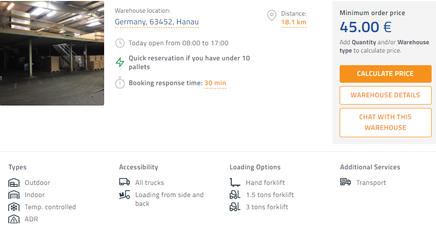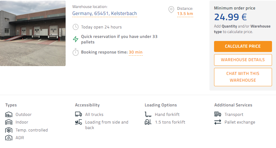 π The third warehouse is located in a city called Kelsterbach (Lager Kelsterbach ) and is 13 km away from Frankfurt. They offer an Instant booking option for up to 33 EURO pallets. This warehouse is a specialist in short-term warehousing.