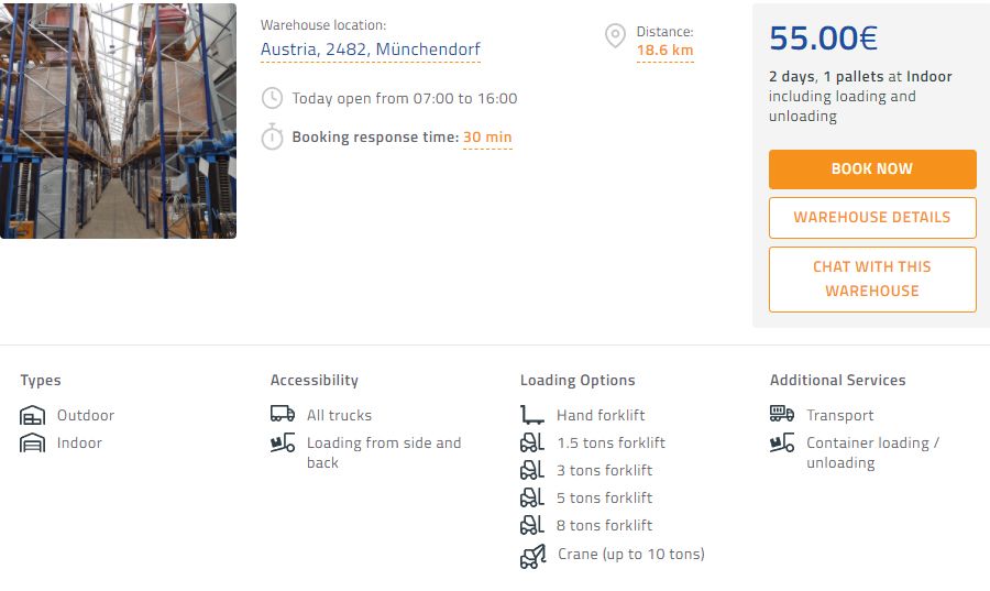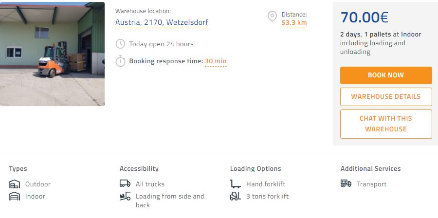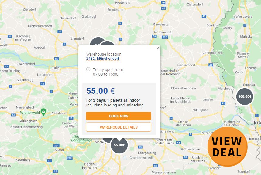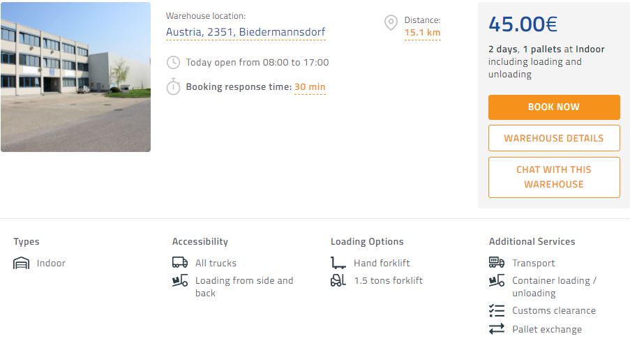 📍 The closest warehouse to Vienna (Wien) city center is only 15km away in a city called Biedermannsdorf. The warehousing price starts at 45,00 EUR. This warehouse also offers the transport and other services.