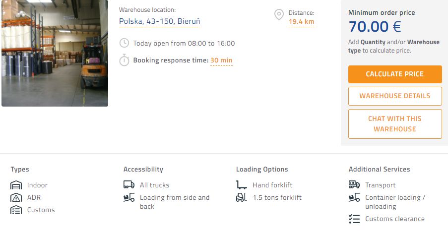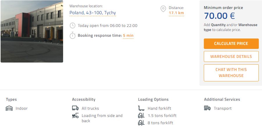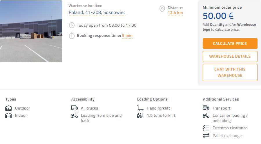 📍 The closest warehouse to Katowice city center is located only 12km away in a city called Sosnowiec. The warehousing price starts at 50,00 EUR. This warehouse also offers transport service.