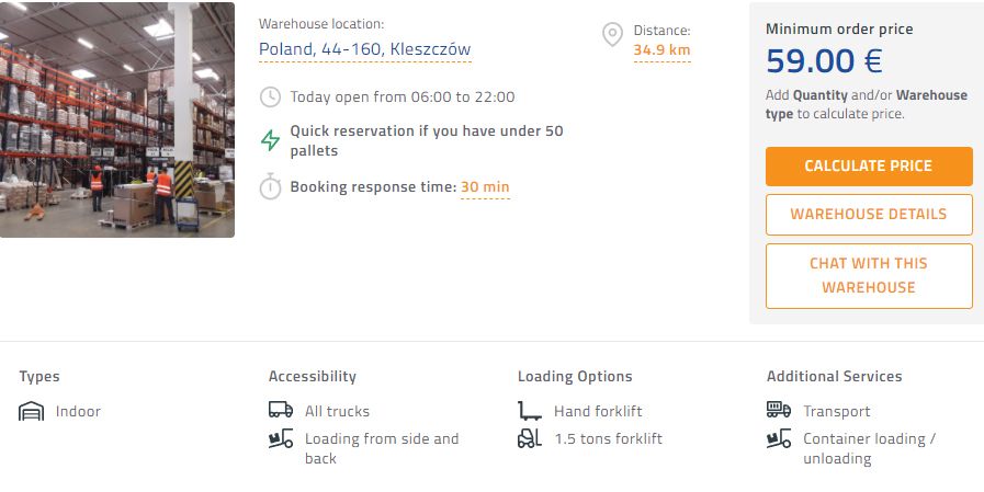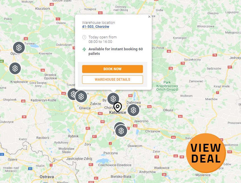 📍 The fourth warehouse is located in a city called Kleszczow and is 35 km away from Katowice. This storage offers an INSTANT booking option up to 50 EURO pallets.