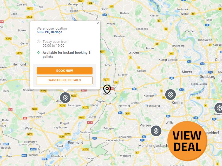 📍 The closest warehouse in Venlo is located in the city called Belfeld. This warehousing is the closest and it is 6km away from Venlo. This indoor warehouse also offers transport services. Check the warehouse in Belfeld here.