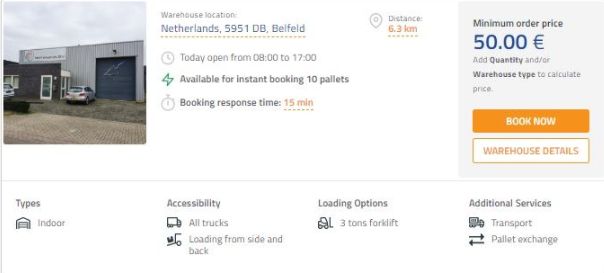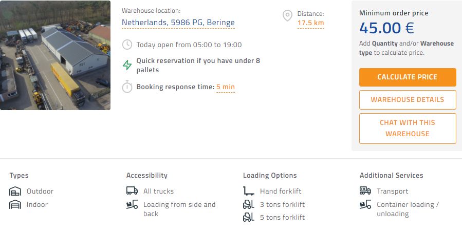 📍 The second warehouse is located in Beringen. This storage is 17 km away from Venlo city center and it is available for Instant booking up to 8 EURO pallets. This warehouse also has outdoor space for cargo pre-load and storing.
