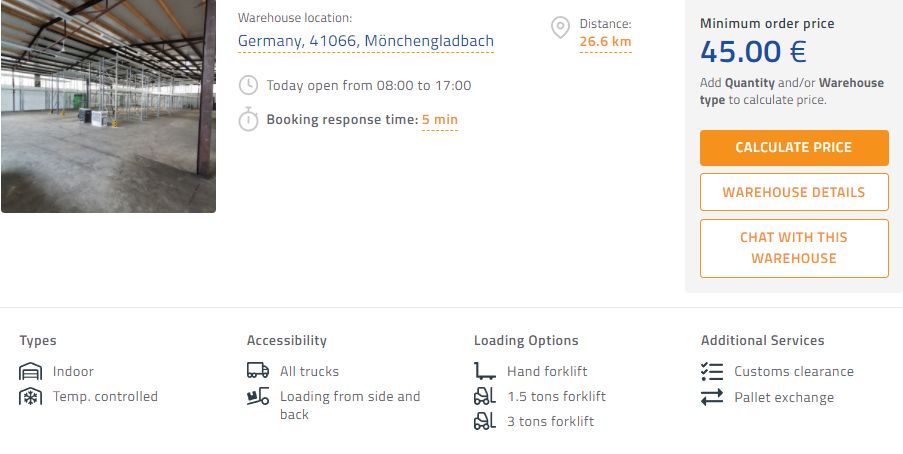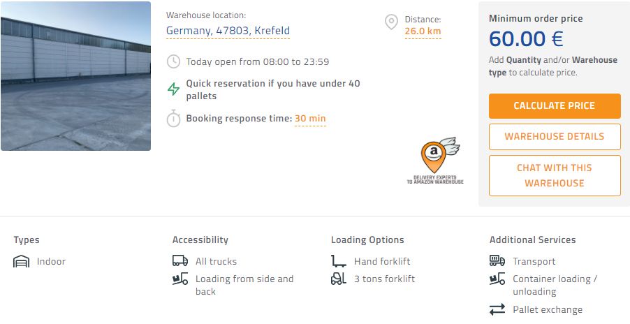 📍 The third warehouse is located 26 km from Venlo city center. This storage in Krefeld offers standard Indoor warehouse space and many additional services as "Container loading and unloading". This warehouse is a specialist for delivery to Amazon warehouse.