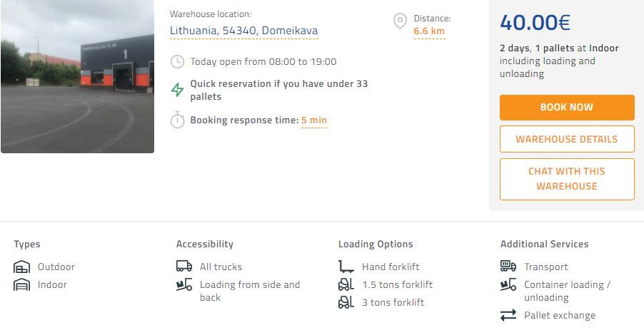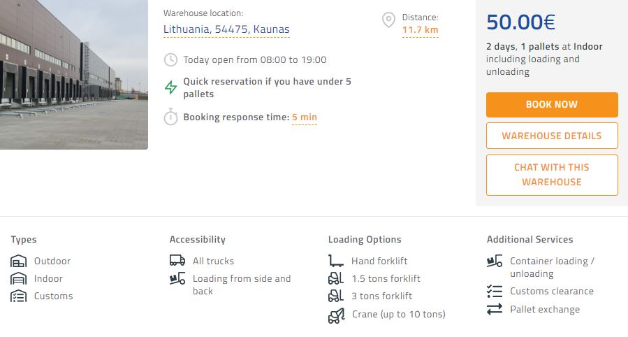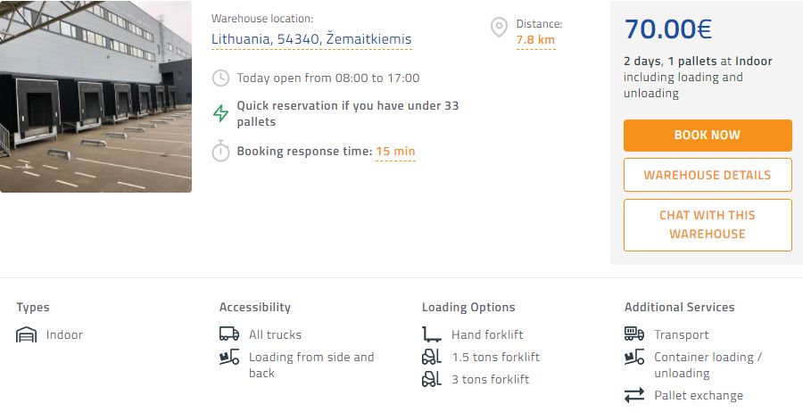 Warehouses can also do additional services as well. Warehouses in Kaunas offer container loading and unloading services, customs clearance services, pallet exchange, packing, and transport services (distribution). You can see which services they provide and their prices at every warehouse profile.